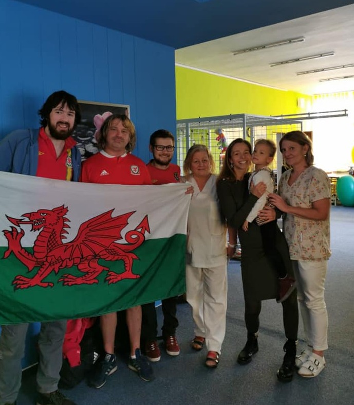 Diwrnod ar ôl ein gêm yn erbyn Slofacia, ymwelodd grŵp o gynrychiolwyr elusen y cefnogwyr, Gôl Cymru, â Sanatoriwm Plant yn ardal Trnava. Mae’r ganolfan yn cynnig cymorth i blant rhwng 3 a 6 oed sy’n dioddef gyda phroblemau corfforol gyda rhodd o €500.